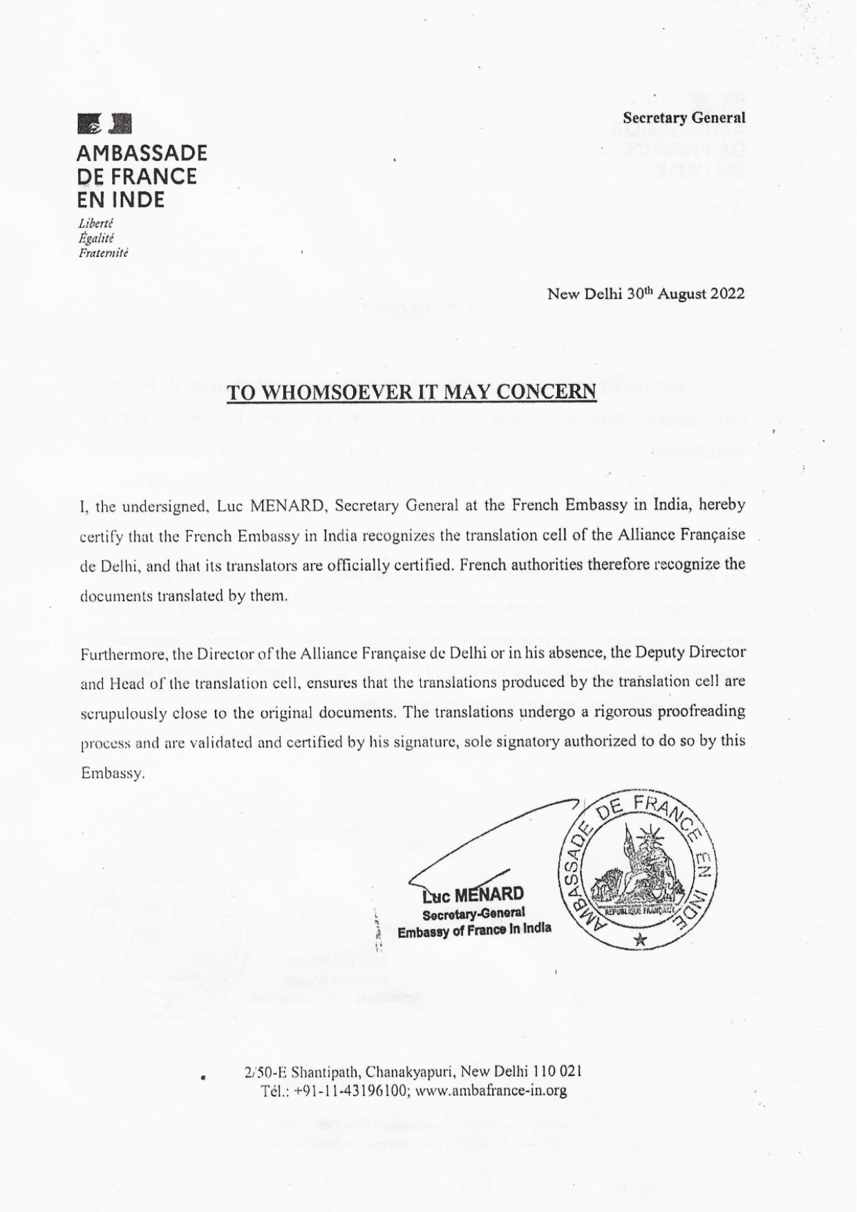 - A Translation Affidavit/Certificate that includes: • A statement confirming the accuracy of the translation.